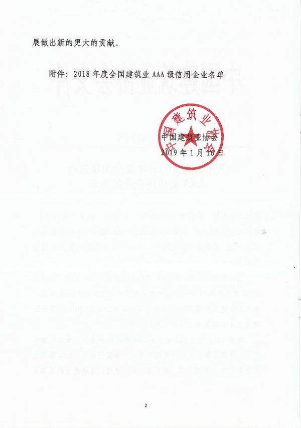 近日,中国建筑业协会公布了2018年度全国建筑业AAA级信用企业评价结果,甘肃懋达建设工程有限公司获评“2018年度全国建筑业AAA级信用企业”荣誉称号。